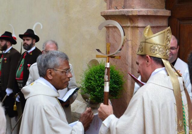 Am Sonntag, 25. August 2019, hat Bischof Ivo Muser bei einem feierlichen Gottesdienst Mathew Kozhuppakalam von den Missionaren des Hl. Franz von Sales, die seit Mai 2018 das Kapuzinerkloster in Schlanders beleben, zum Pfarradministrator und Dekan eingesetzt. Die rechtliche Vertretung der Pfarrei übernimmt der Kooperator Sebastian Egger. Pfarrgemeinderatspräsident Kurt Gufler und Bürgermeister Dieter Pinggera dankten dem nunmehrigen Altdekan für sein Wirken und für seine Leistungen, die sich lang wie eine Litanei anhörten. Dekan Mathew hält es mit dem Apostel Paulus, der zu den Philippern sagte: „Alles vermag ich durch den, der mich stärkt!“ Er meinte damit den göttlichen Vater und alle in den Pfarreien von Schlanders und Kortsch und im Dekanat.